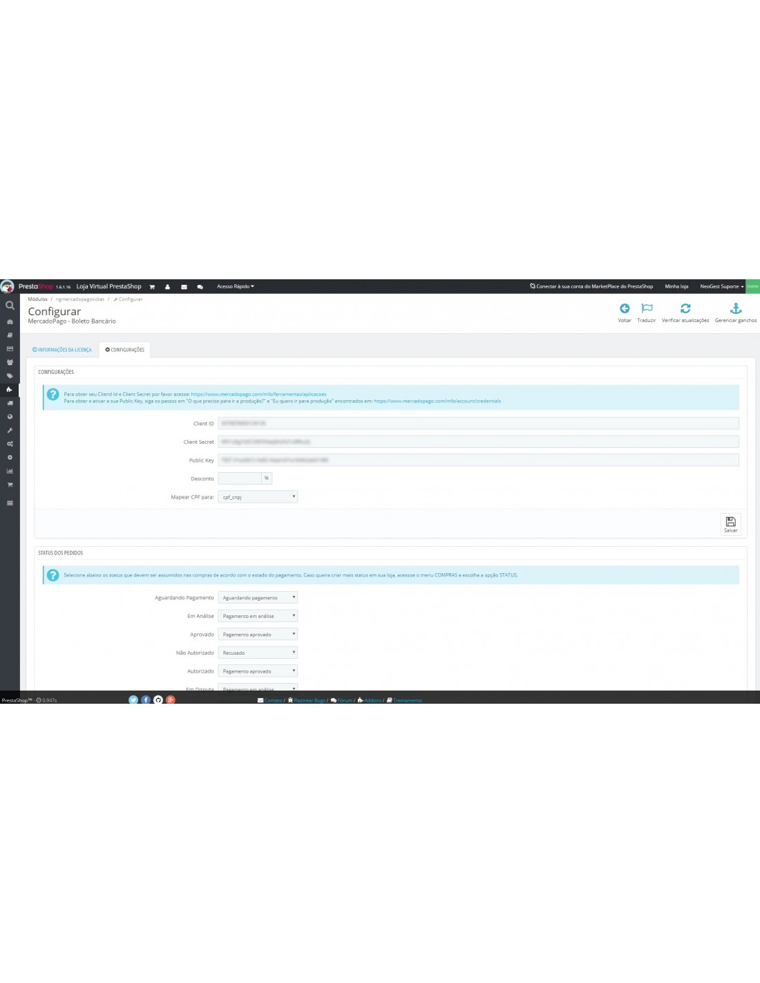 • Acesse a página de configuração do MercadoPago no PrestaShop e preencha os campos “Client_ID”, “Client_secret” e “Public_Key”.